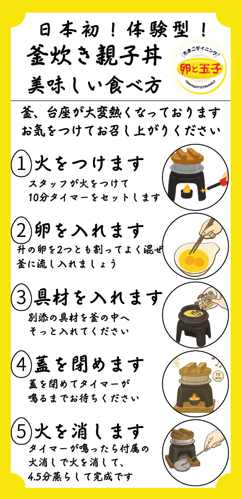 火をつけて、待って、香りを感じて、自分の手で“完成させる”日本初の体験型親子丼です。